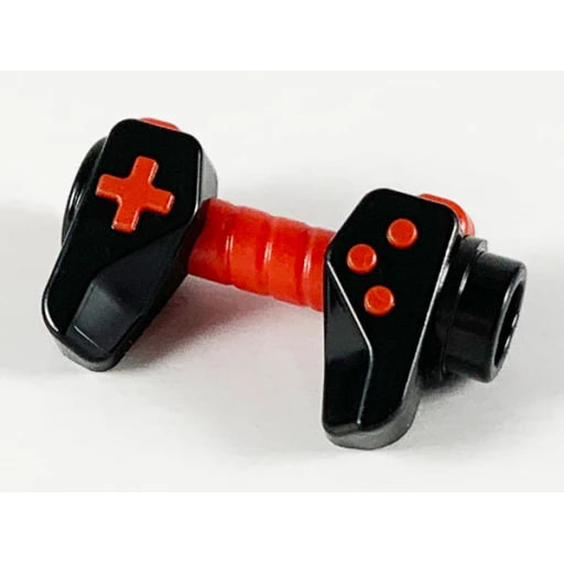 Отдельная деталь ЛЕГО - геймпад с красными кнопками и центральной ручкой. Имеет боковые отверстия.